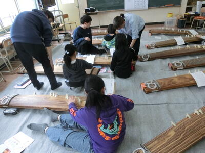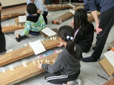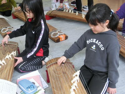 美しい音色(琴) 投稿: 管理者 (15:15) 音楽の教科書に、琴の紹介があります。 実際に講師をお呼びして、音を奏でる学習をしました。 日本古来の楽器から出る音は、甲高く響いていました。 「さくら♪ さくら♪・・・。」 春、待ち遠しいこの頃。 6年生も卒業式に向けて準備を始めています。